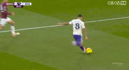 第50分钟,蒂勒曼斯传中,罗杰斯停球射门一气呵成,维拉2-2西汉姆联